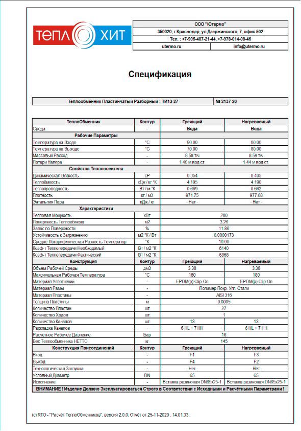 | Пластинчатый теплообменник ТИ13-27 расчет № 2137-20 | 1 | Теплохит |